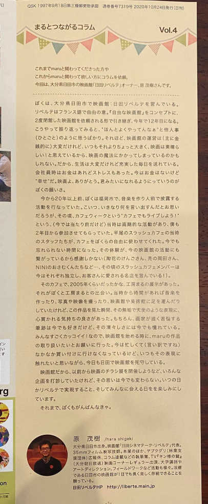 福岡の福祉作業所であり、障害のある約50名のメンバーが3つのアトリエを拠点に絵画や陶芸など創作を中心に活動している「工房まる」が発行しているフリーペーパー「maru paper」にオーナー原がまるへの想いを寄稿しています。