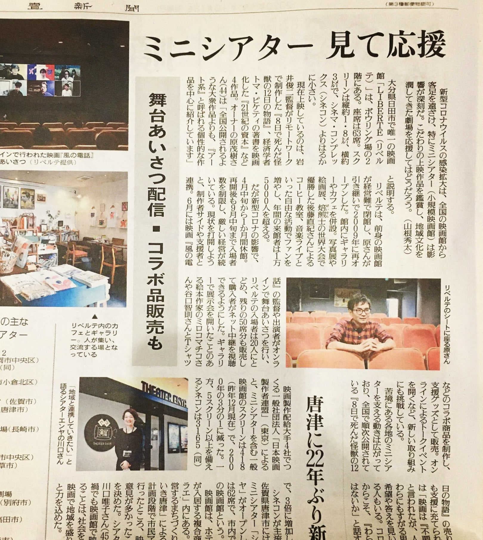 新型コロナウイルスの影響を受け、厳しい状況にあるミニシアターの取り組みや支援の動きについて、数ある映画館の中からリベルテを山根記者が取材してくださいました。『風の電話』オンライントークイベントや、谷口智則さんとミロコマチコさんとのコロナ支援アイテムなど、リベルテの活動について書いてくださっています。